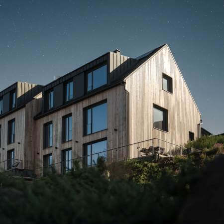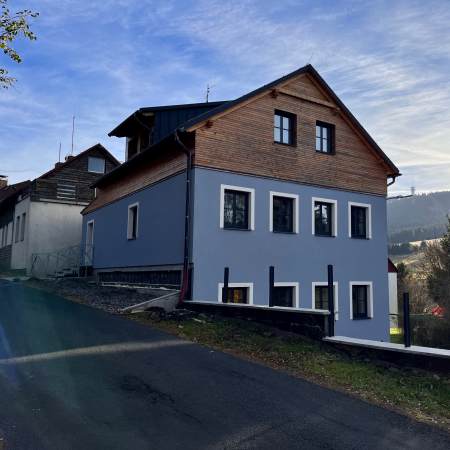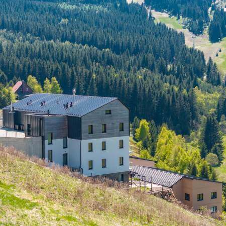 Jedinečný projekt nacházející se na slunném svahu v horské obci přímo pod úpatím Klínovce. Svým pojetím a vybavením splní představy nejnáročnější klientele. Dva na sebe navazující rodinné domy zasazené do terénu tvoří harmonický celek s úchvatným výhledem na dvě krušnohorské dominanty Klínovec a Fichtelberg.
